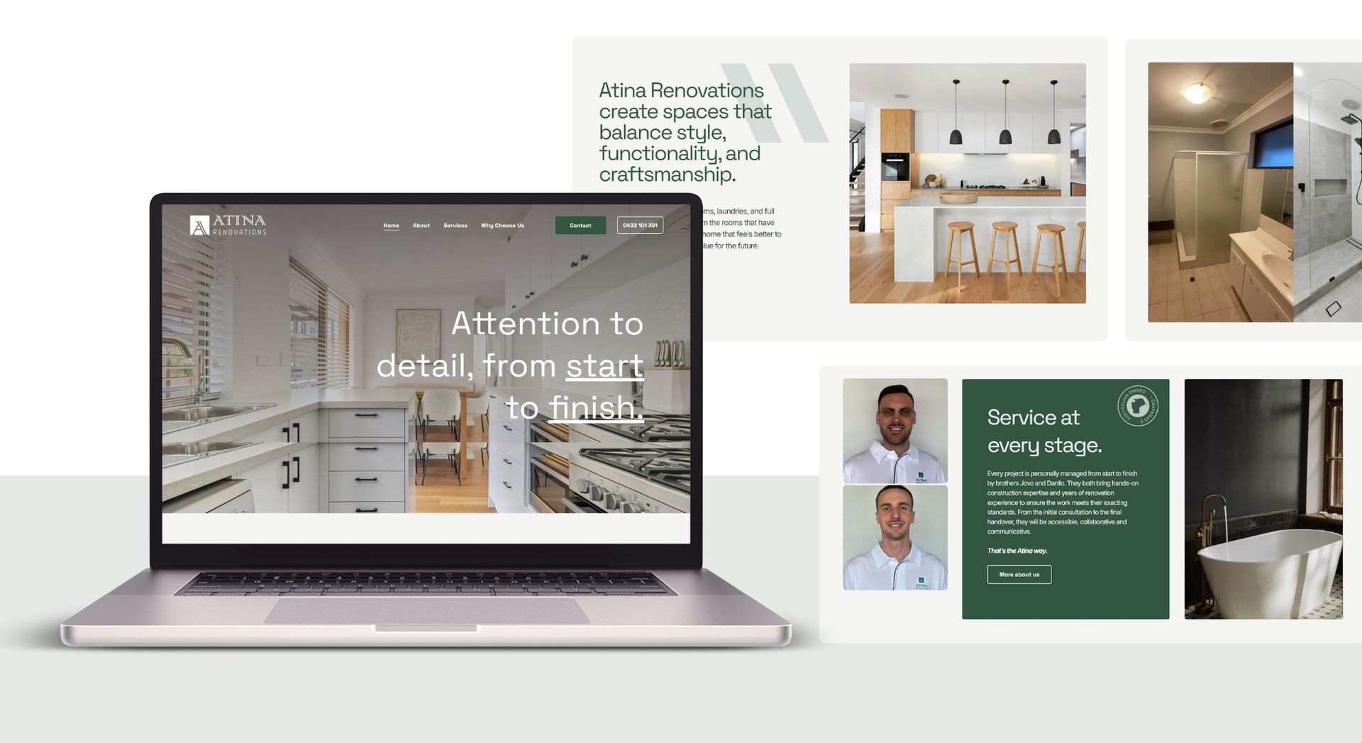 The primary goal was to modernize Atina Renovations' online presence to better reflect their expertise and attract potential clients. The existing website was outdated, lacked mobile responsiveness, and did not effectively showcase their portfolio.